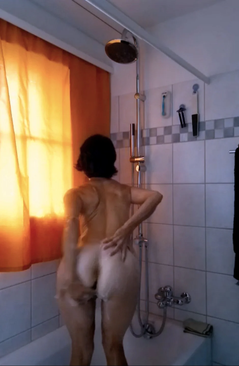 Naked brunette in a mask in the shower