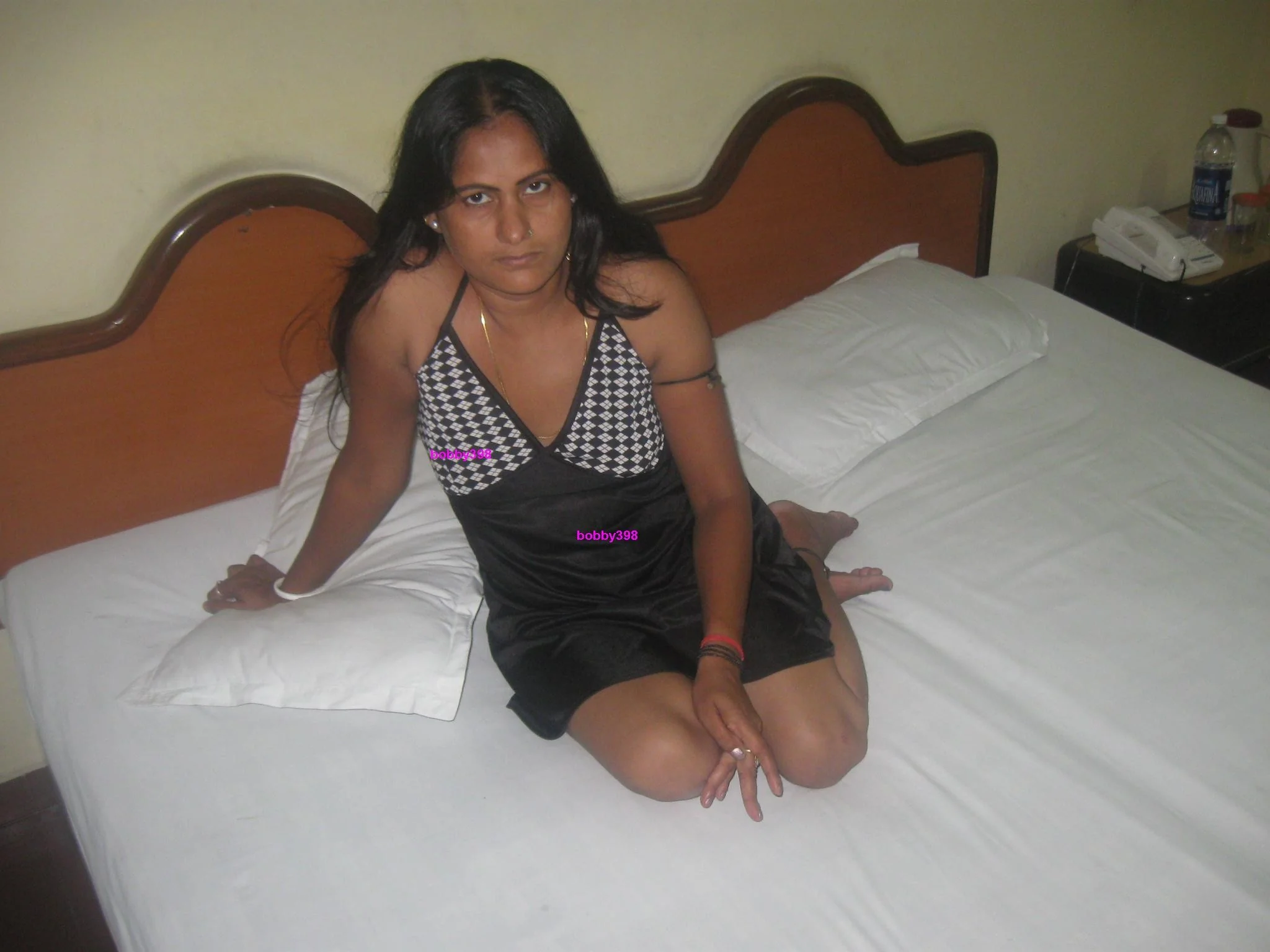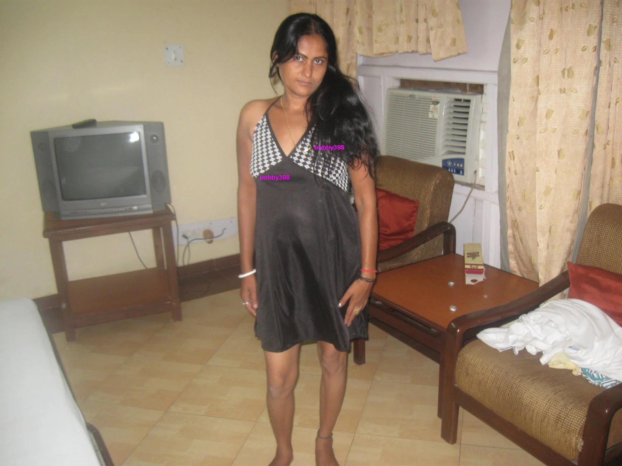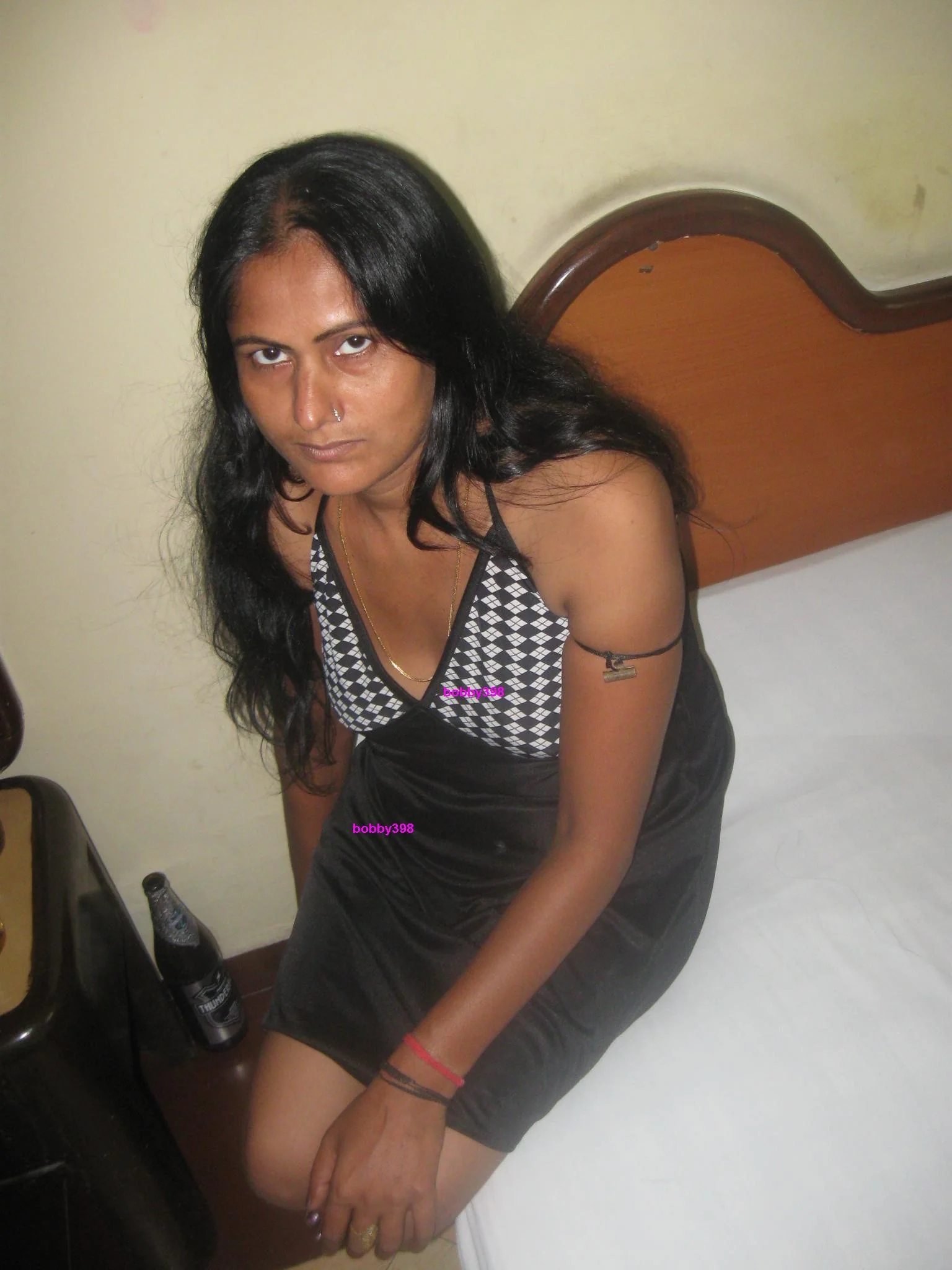 Femme à la peau foncée boit de la bière dans une chambre d'hôtel et...