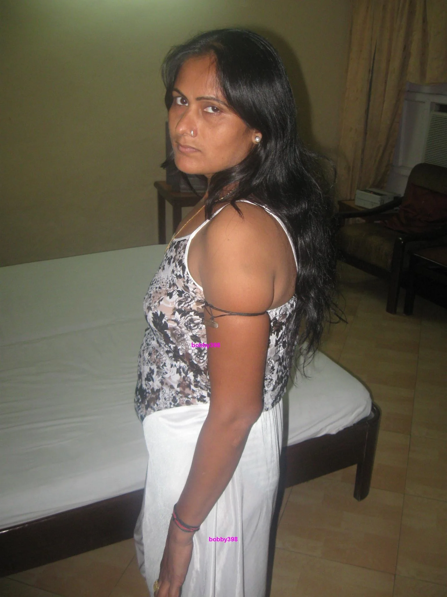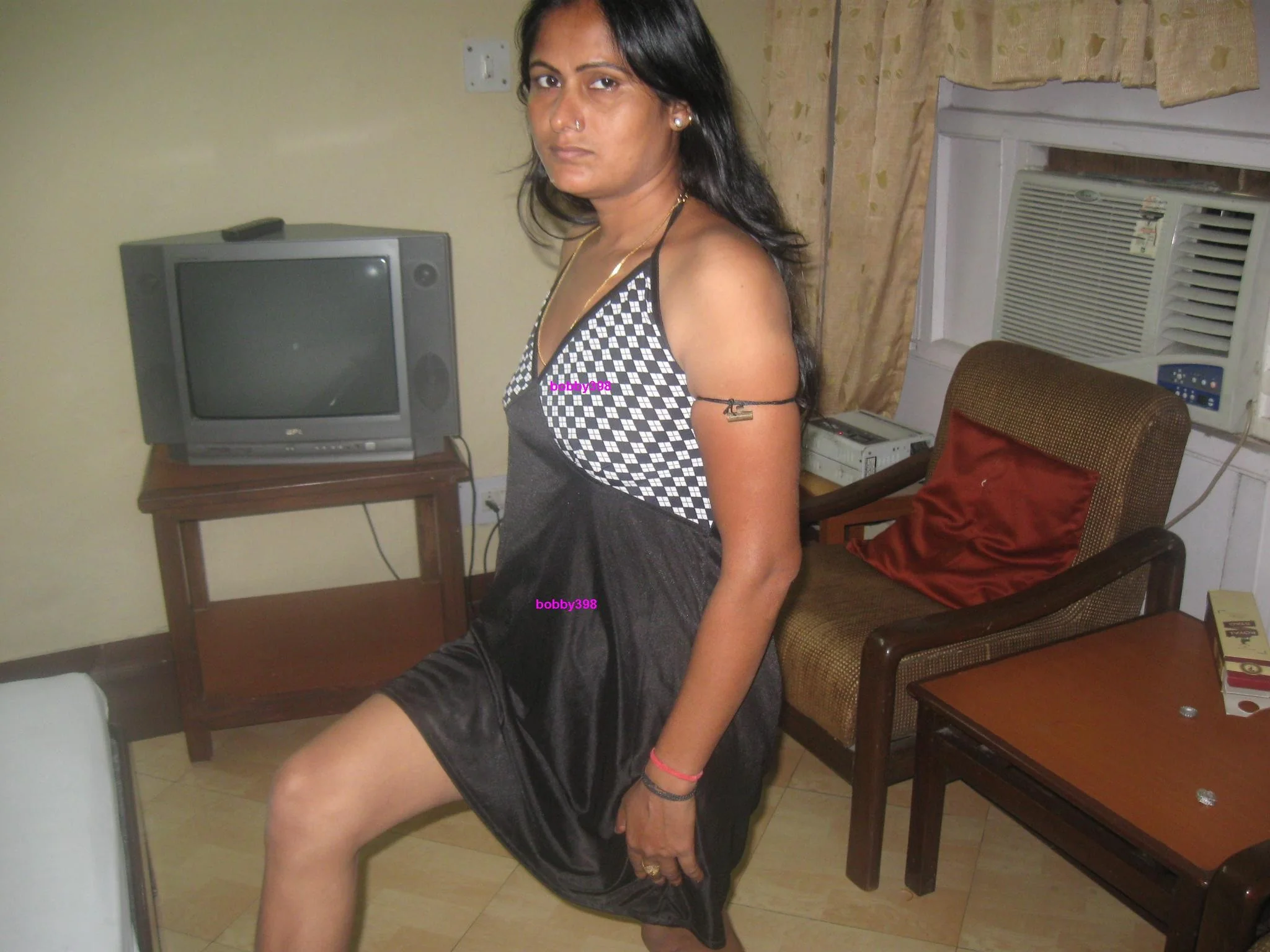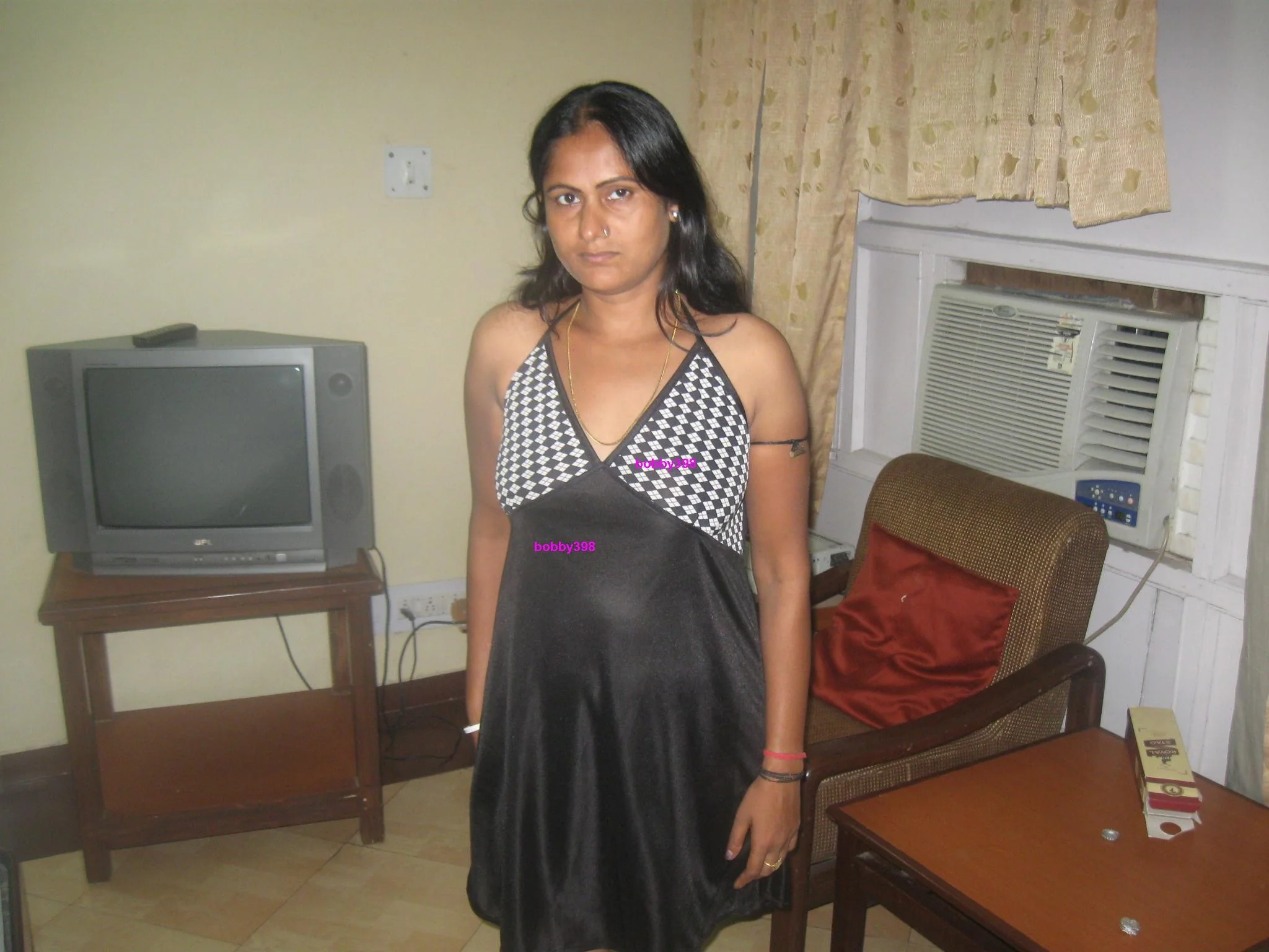 Femme à la peau foncée boit de la bière dans une chambre d'hôtel et...